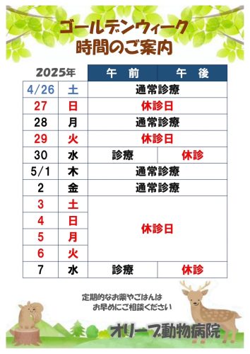 大型連休中は、薬品会社などもお休みに入る為、フードやサプリメントなどは早めにご注文いただけると助かります。